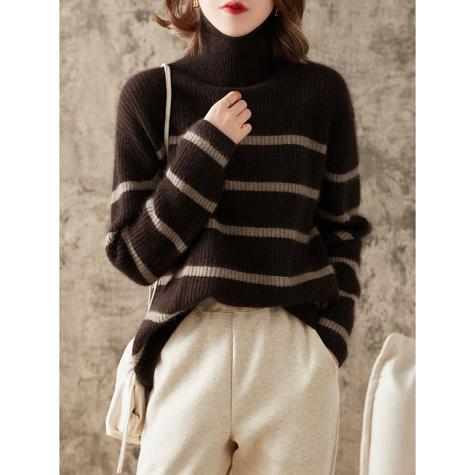 40代ファッションにぴったりの上品な横縞デザインが魅力のタートルネックニット。