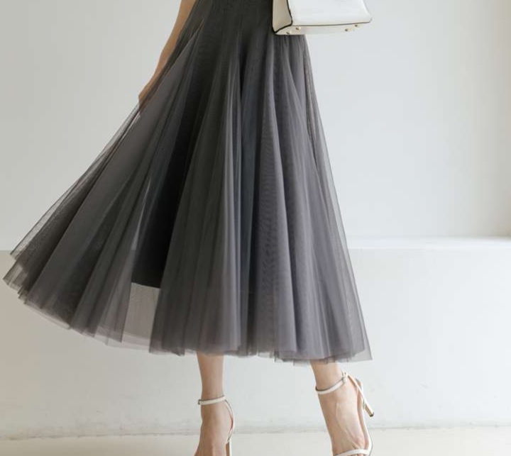 チュール素材の軽やかな透け感とミモレ丈のバランスが大人の女性らしさを引き立てる