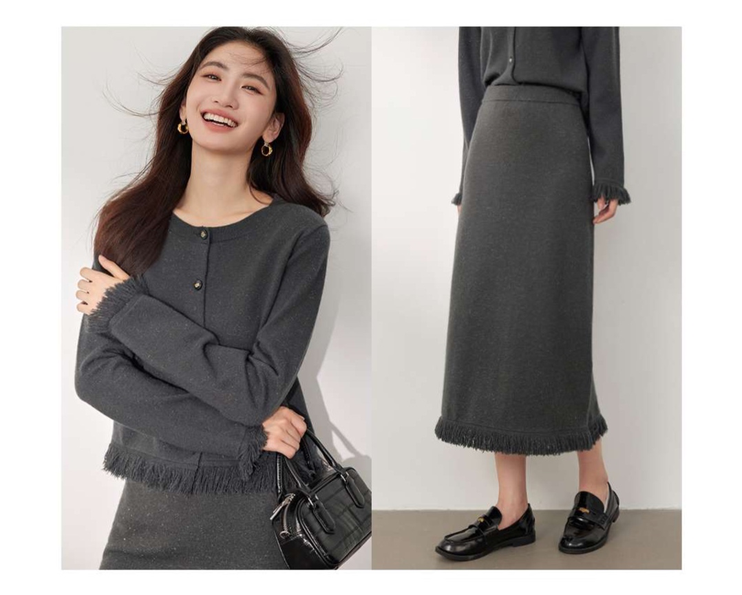 カーディガンとスカートの2点セットで、きれいめカジュアルな着こなしができる優美な一着です。