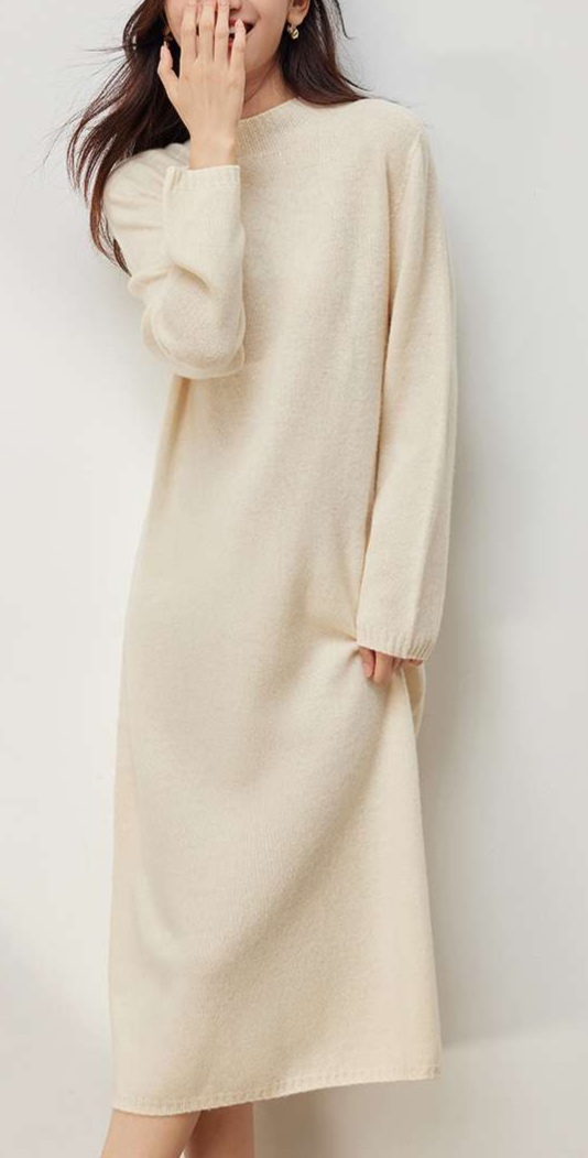 すっきりとした丸首デザインで上品な印象を与え、袖口のリブ編みがさりげないアクセントになっています。