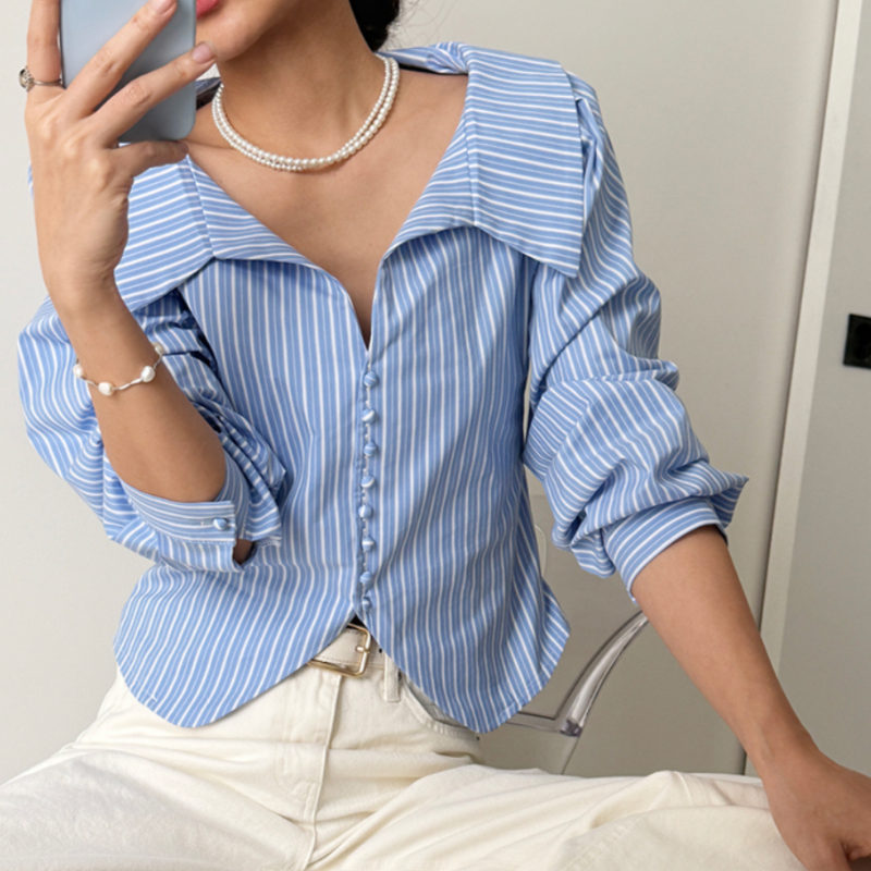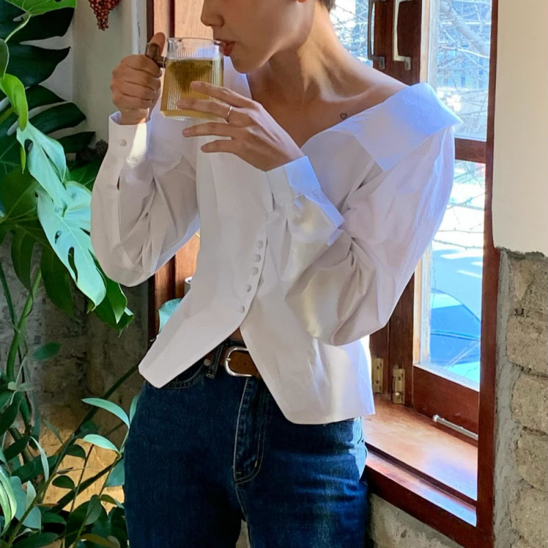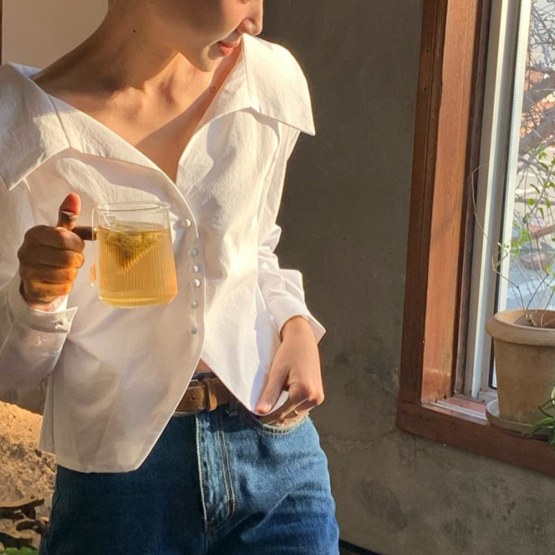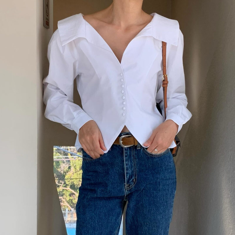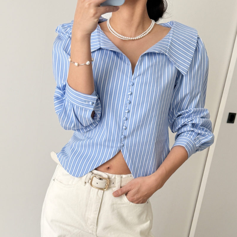 40代ファッションにぴったりの春の新作シャツです。 ウエストラインを美しく見せるシェイプデザインで、上品な印象を演出。 個性的な襟元とボタンデザインが大人の女性らしさを引き立てます。 デニムとの相性も抜群で、きれいめカジュアルスタイルが完成します。