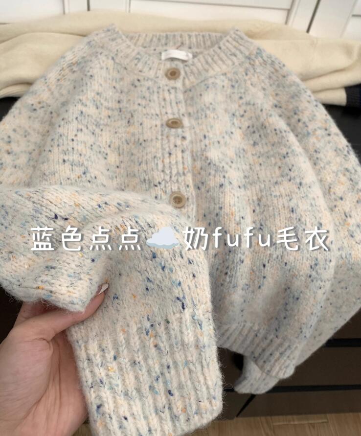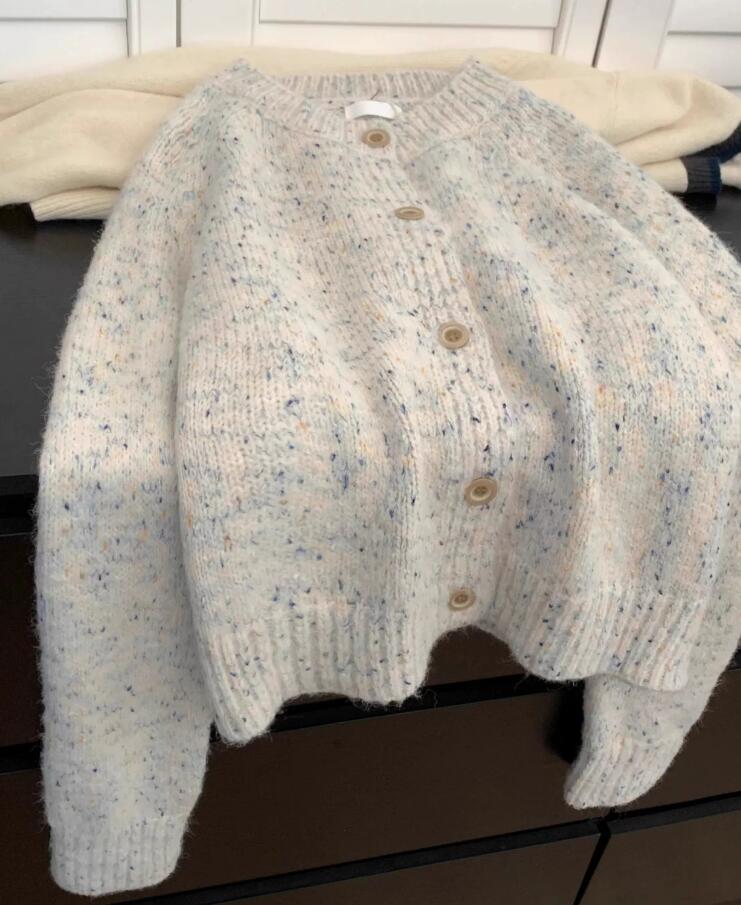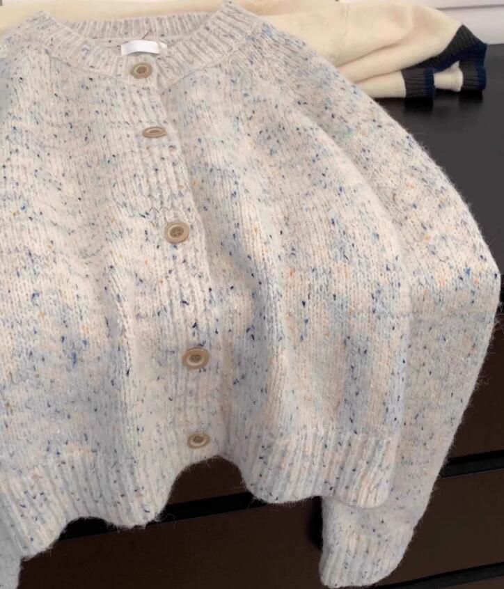 40代ファッションにぴったりの上品なツイード風ニットカーディガンです。 優しいクリーム色とブルーの杢糸が織りなす上品な表情が魅力的。 丸首デザインで着回しやすく、オフィスからカジュアルまで幅広くお使いいただけます。 春秋の羽織物として重宝する一着です。
