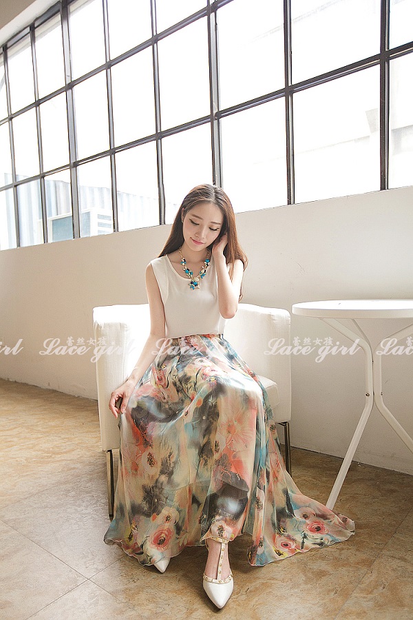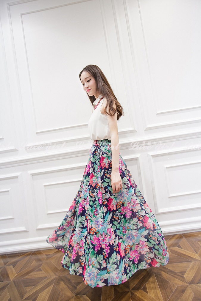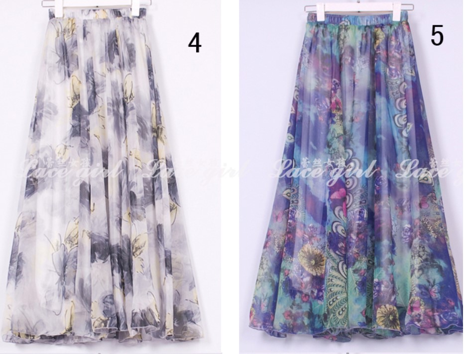 40代ファッションに最適な上品な花柄シフォンロングスカートです。