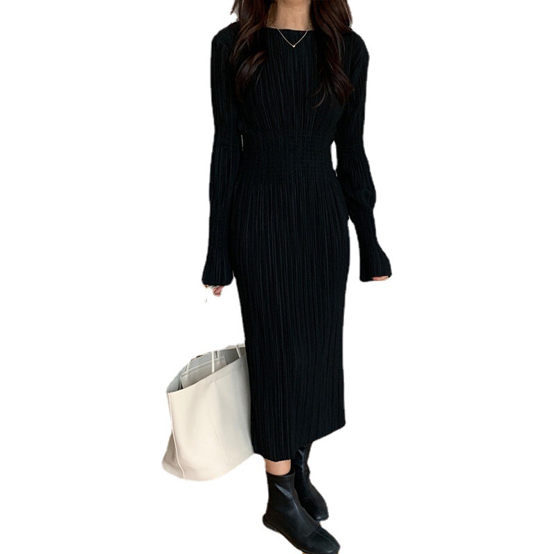縦のラインが美しく、体型をきれいに見せてくれる長袖デザイン。