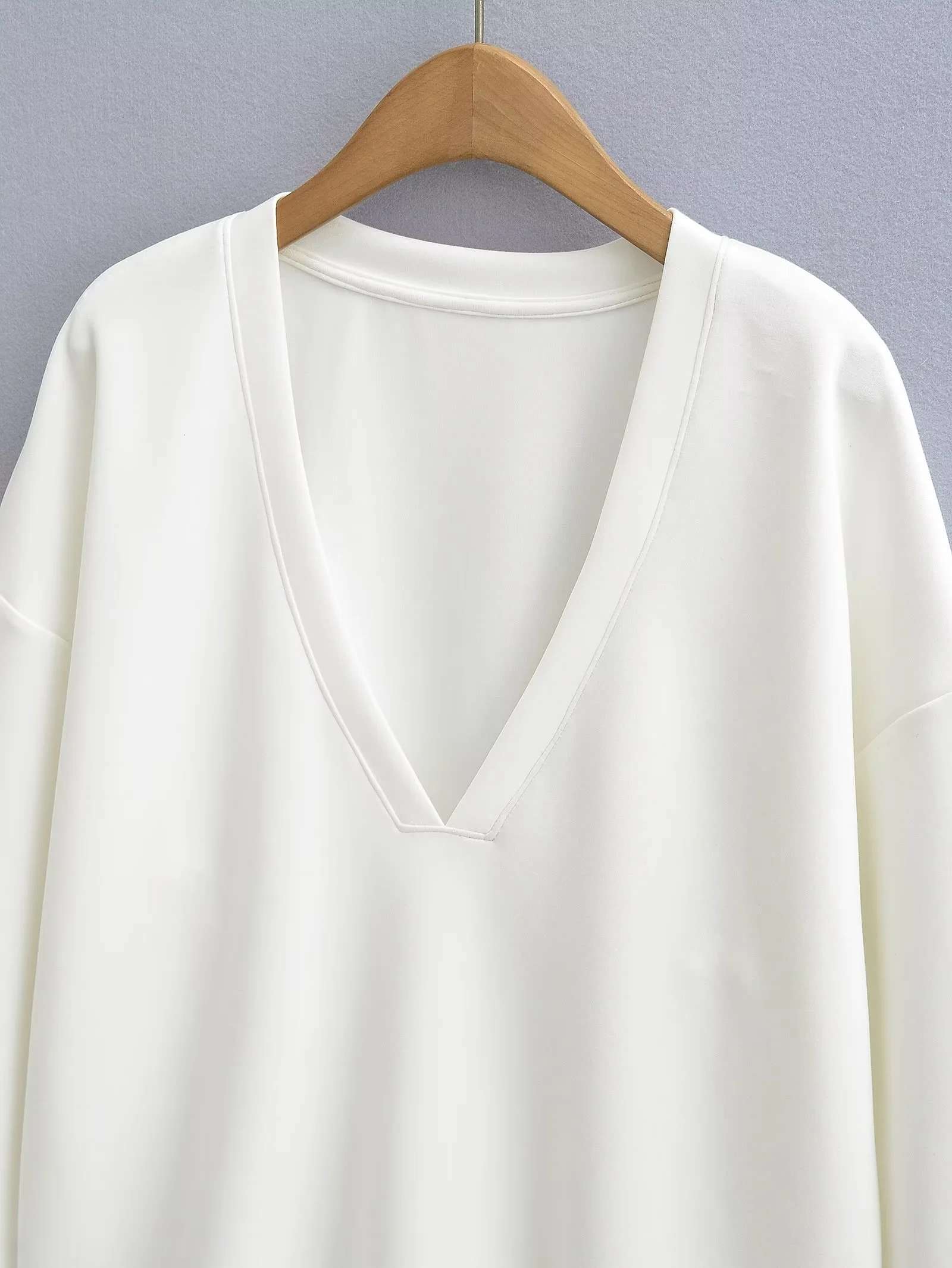 深めのVネックが首元をすっきりと見せ、こなれた大人の着こなしを演出